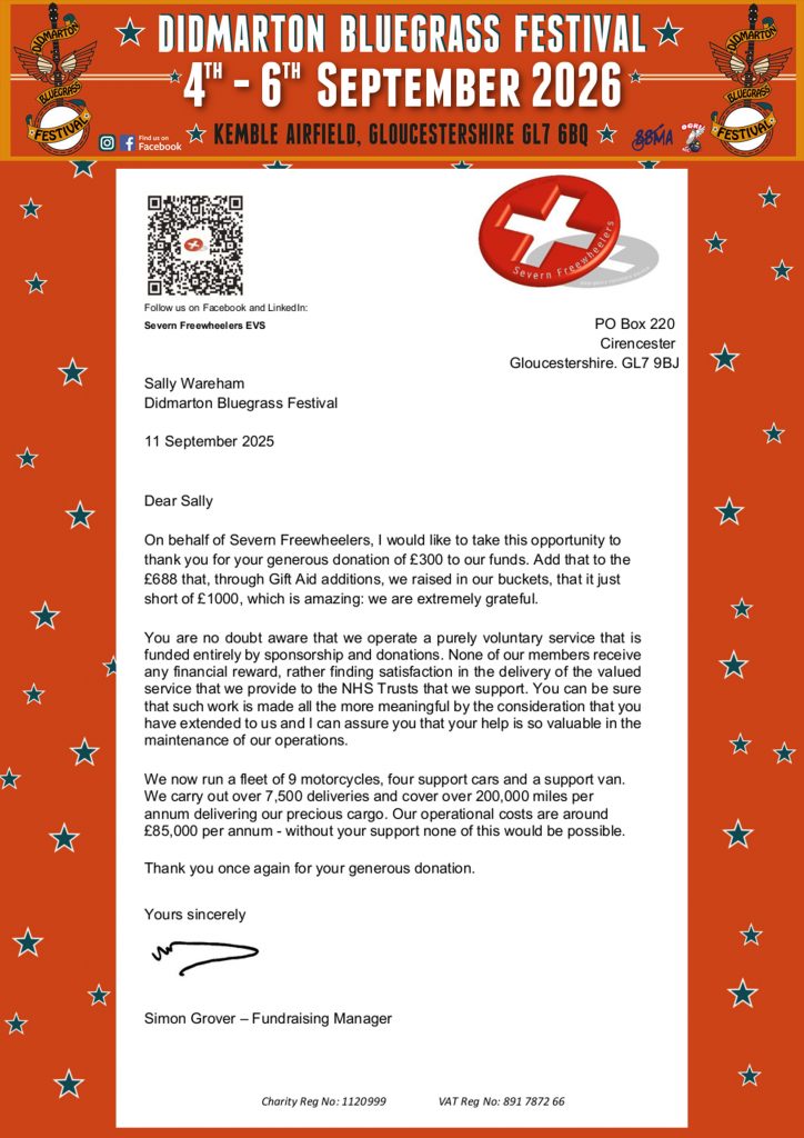 Good afternoon folks, as promised here is the update on your amazing contribution to the Severn Freewheelers EVS Blood Bikes and what better way than to let you read the letter we received from them. The total figure of £988 is from both our bluegrass festival and the Ogri MCC rally the weekend before, what an amazing figure to have been a part of raising for such an incredible charity. Thank you all so much for the support you have shown the Severn Freewheelers Blood Bikes! 😀